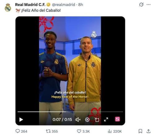 皇马社媒发布了祝贺球迷新年快乐的视频,皇马中场卡马文加和马斯坦托诺出镜,卡马文加特意用中文进行了祝福。