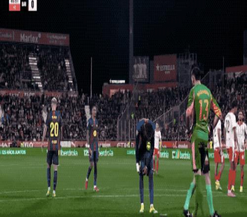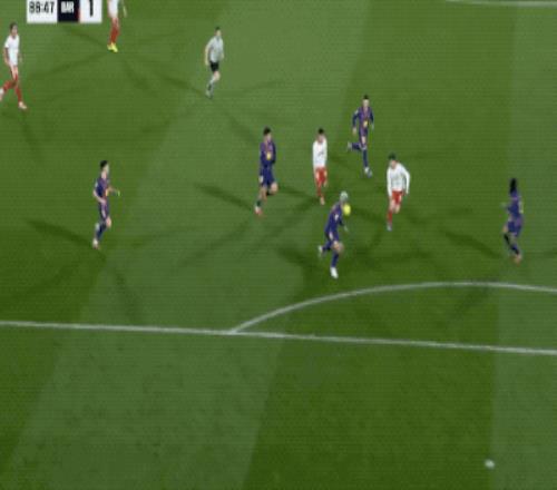 下半场开始后,巴萨继续猛攻,第58分钟,亚马尔将球传到后点,拉菲尼亚的射门打在林孔的头上出了底线,拉菲尼亚无奈苦笑。