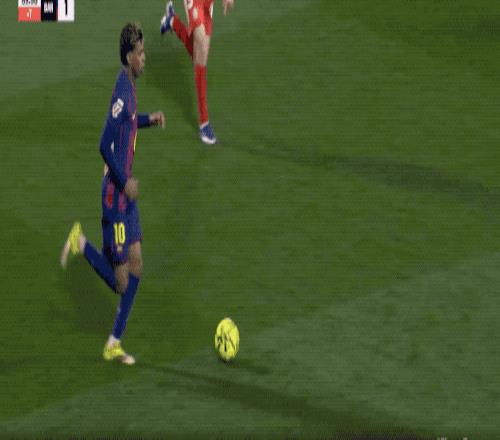 之后的25分钟,巴萨占据了场面上的绝对主动。第43分钟,拉菲尼亚的射门打穿防守球员的小门,可惜皮球击中立柱。