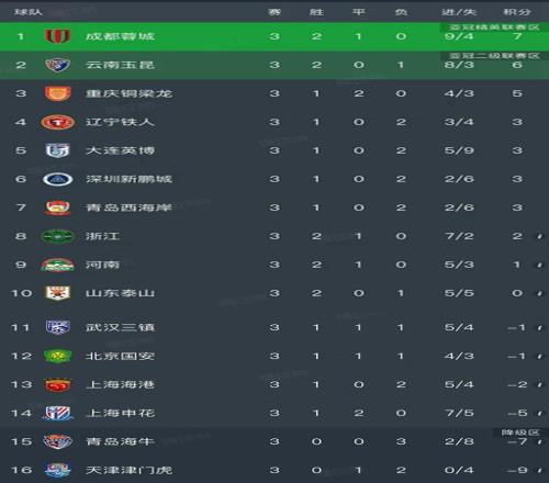 北京时间3月21日,今日的中超联赛第三轮结束了剩下了6场对决,我们看看最新积分榜的变动!主要的战报是:成都蓉城3-3重庆铜梁龙,河南队1-1武汉三镇,山东泰山0-4惨败云南玉昆,青岛西海岸1-0深圳新鹏城,辽宁铁人3-0天津津门虎,北京国安1-1上海申花!