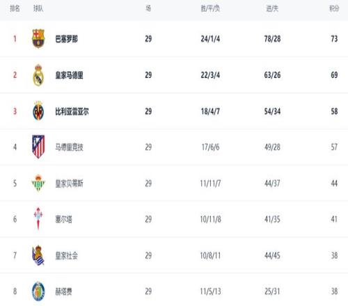 在积分榜上,巴萨依然占据榜首位置,拿到73分。皇马险胜之后紧随其后,拿到69分,依然是落后4分。冠军的争夺非常激烈。比利亚雷亚尔以58分排名第3。马竞输球,依然是57分,排名第4。皇家贝蒂斯以44分排名第5。塞尔塔拿到41分,排名第6。