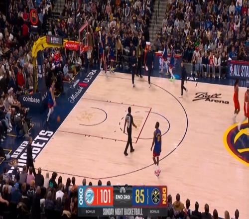 第三节,雷霆攻防两端压制对手,单节39-30净胜掘金9分,三节打完握有16分优势。