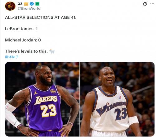 湖人自媒体、詹姆斯自媒体@BronWorld对比了41岁时入选全明星次数:詹姆斯1、乔丹0(41岁时已退役)。并写道:“不是一个级别。